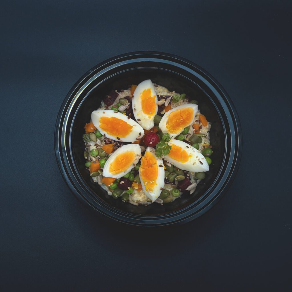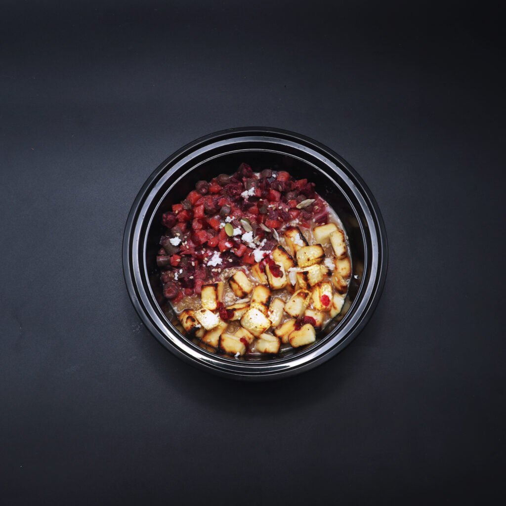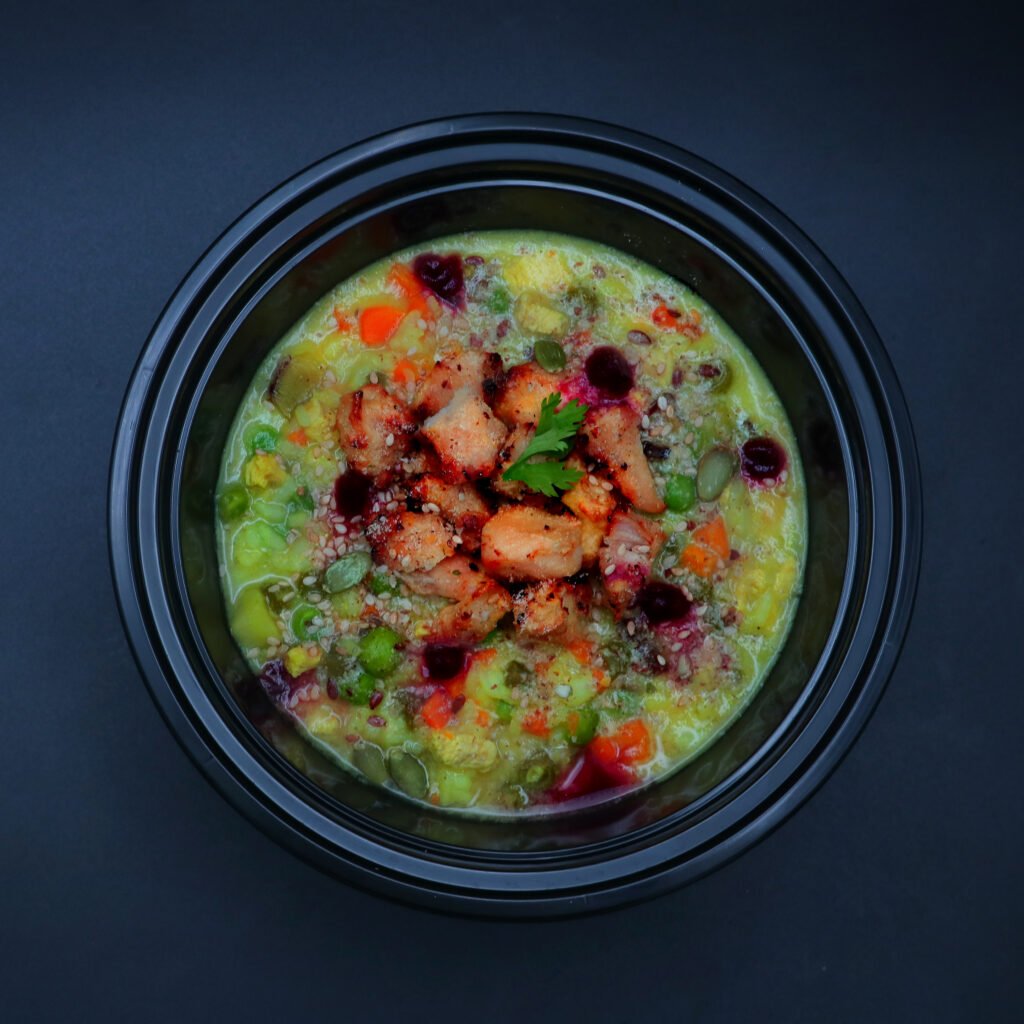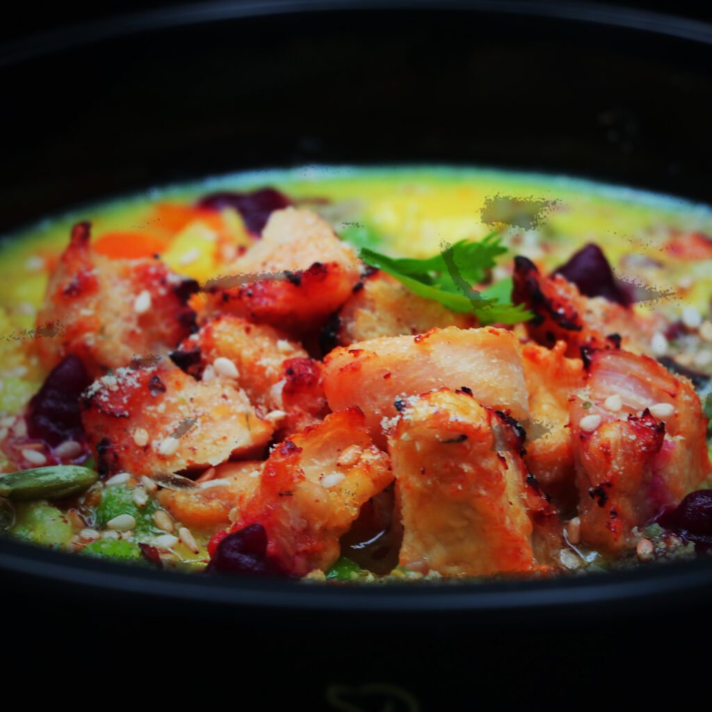Broth oats with chicken, veggies & beet—gut-soothing, protein-rich comfort bowl topped with crispy chicken poppers.