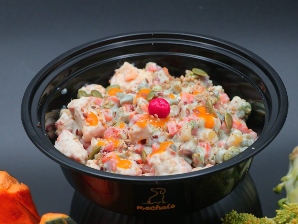 Freshly tossed Fish Salad with Basa poppers, sardine paste & veggies — rich in Omega-3, protein & fibre for shiny coats & happy tummies!