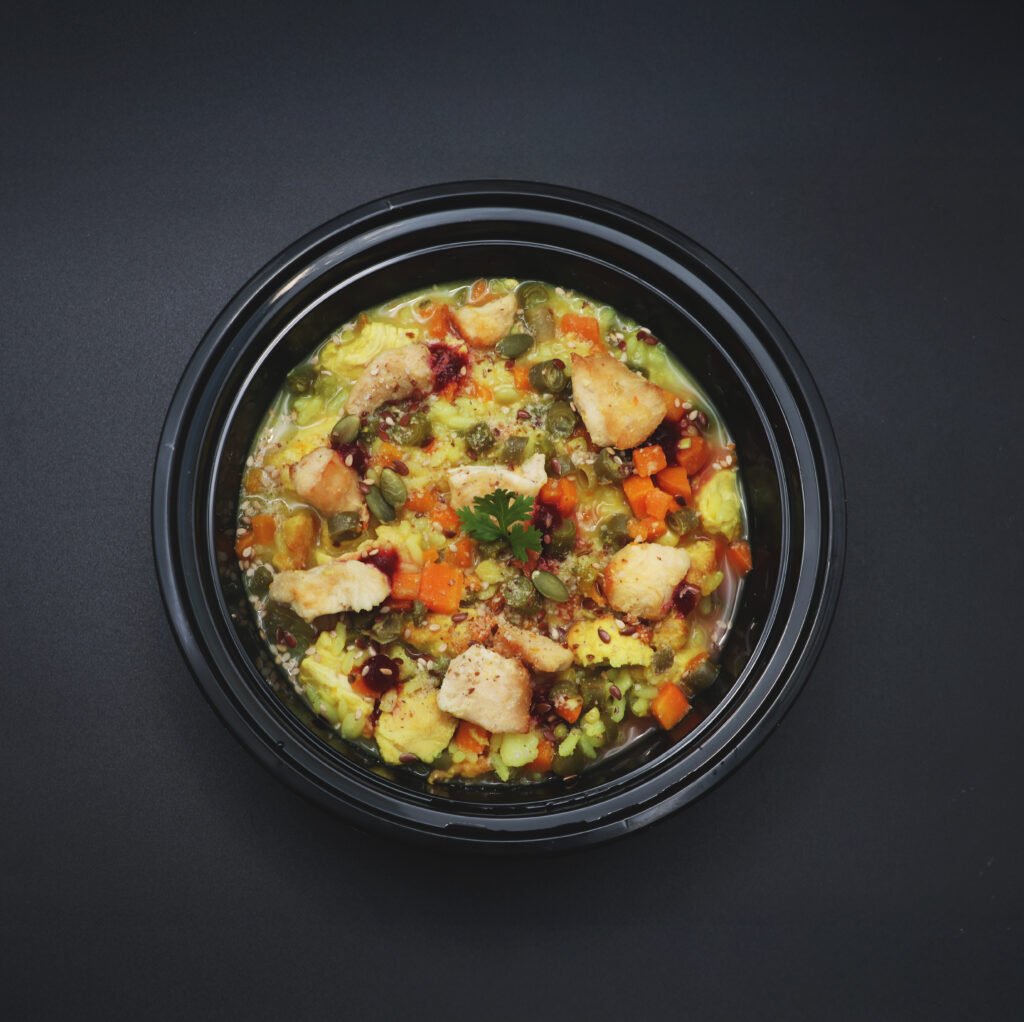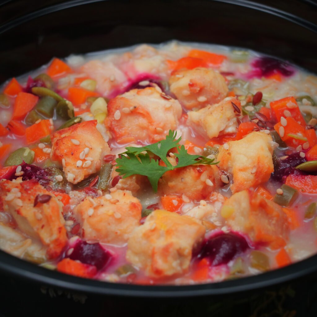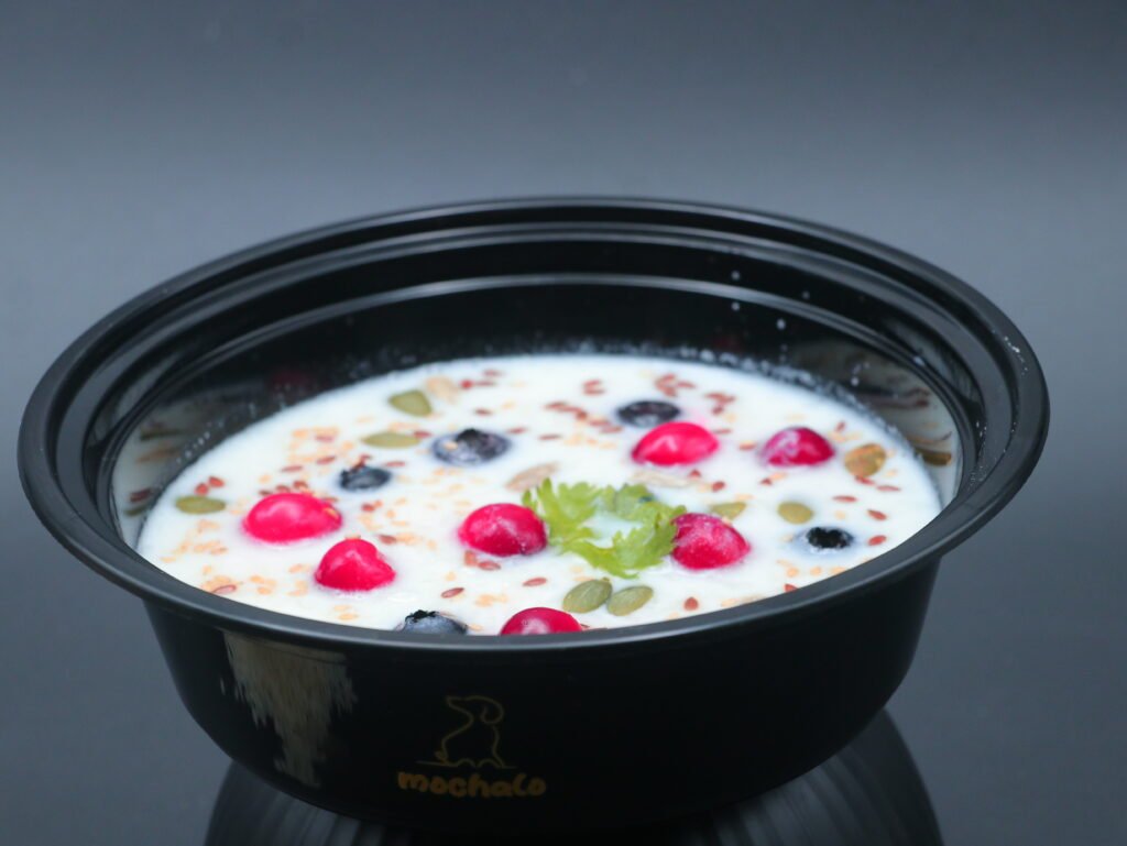 A soothing, gut-loving bowl crafted with soft-cooked rice gently folded into creamy curd, creating a light and cooling risotto perfect for warmer days or sensitive tummies. Infused with the natural sweetness of cranberries and blueberries, this dish is rich in antioxidants and bursting with flavor. A crunchy sprinkle of assorted roasted seeds adds texture and essential omega-3s for coat and joint health, while a fresh coriander leaf on top offers a final herbal flourish.