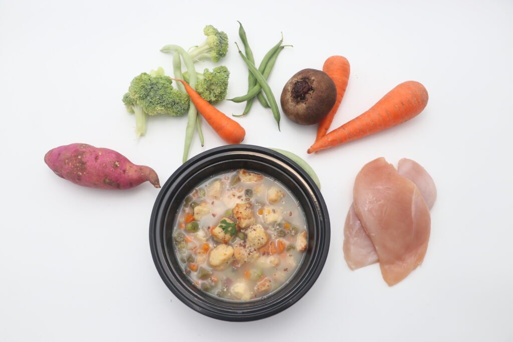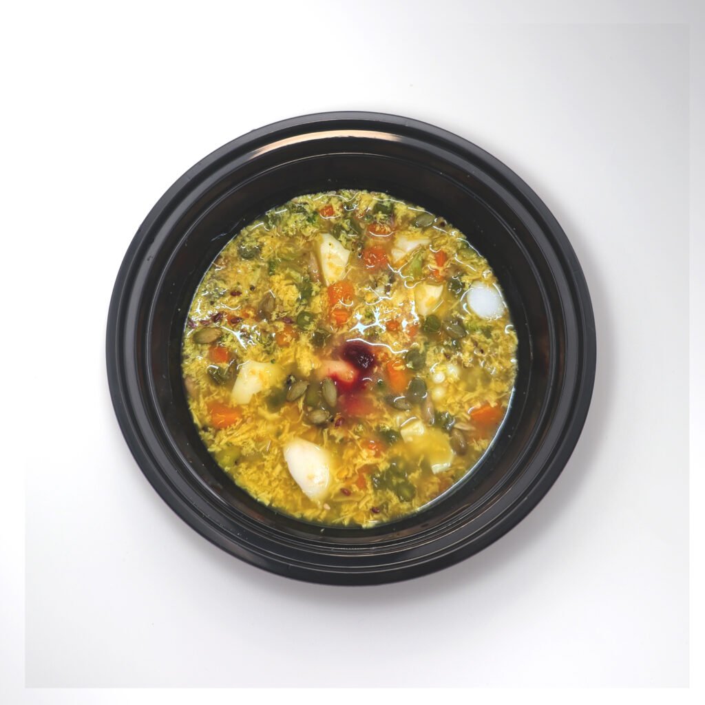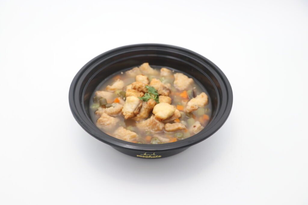A comforting bowl simmered in nourishing fish broth, brimming with tender broccoli, carrots, pumpkin, and sweet potato for a fiber-rich boost. Filled with juicy boiled fish pieces and lightly thickened with corn starch for a cozy texture. Garnished with fresh coriander—a wholesome stew that’s gentle on the gut and big on flavor.